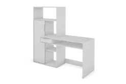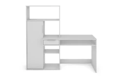 Der Schreibtisch überzeugt mit seinem modernen, edlen Design und bietet reichlich Stauraum. Der Bürotisch verfügt über eine Schublade und ein offenes Fach unter der Tischplatte, sowie ein großes Hochregal mit Tür und weiteren offenen Fächern. Der moderne Arbeitstisch besticht durch seine pflegeleichte Melaminbeschichtung in Weiß, welche robust und langlebig ist. Die Tür und die Schubladen haben silberfarbene Kunststoff-Griffe, welche das schlichte Design abrunden.