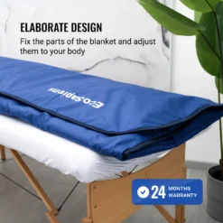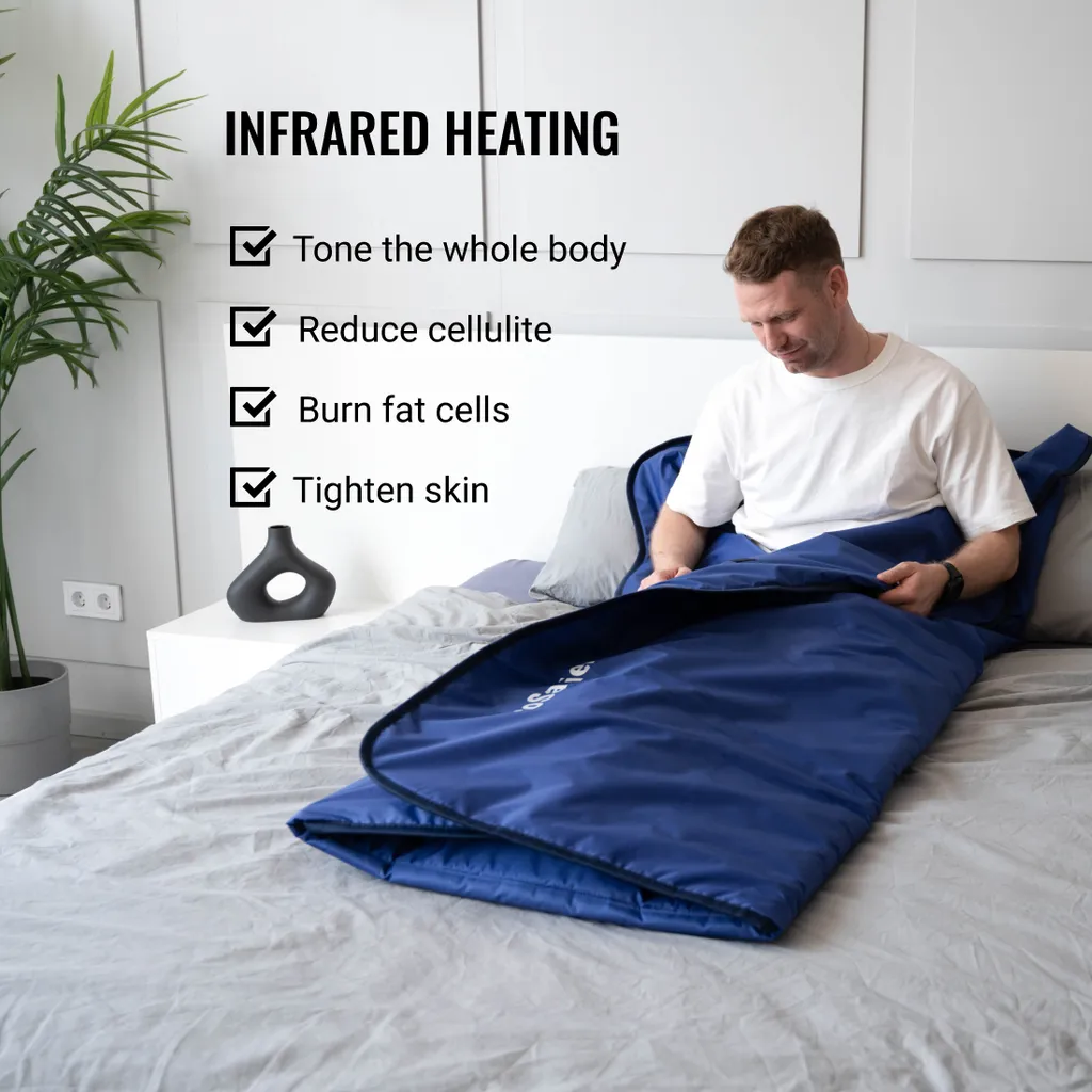 Saunadecke hat zwei Heizbereiche (Ober- und Unterkörper), die gleichzeitig oder getrennt funktionieren können. Sie können den Bereich von den Schultern bis zum Unterbauch oder Hüften, Gesäß und Beinen aufwärmen. Das Design dieser Decke ermöglicht es, die Arme separat einzuwickeln und den Rücken leicht zu wärmen, ohne die Brust zu überhitzen. Zwecks bequemerer Nutzung ist die Saunadecke mit einer Fernbedienung ausgestattet. Es gibt 9 Wärmemodi. Je nach Art der Behandlung und des Detox-Verfahrens können Sie die Temperaturstufe (von 30 bis 55 Grad) auswählen. Die automatische Ausschaltfunktion schaltet die Saunadecke sicherheitshalber nach 60 Minuten aus. Die Infrarot-Wärmedecke besteht aus hochwertigem Oxford-Stoff, der wasserdicht und leicht zum Reinigen ist.