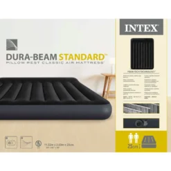 Lieferumfang: Ein Luftbett „Pillow Rest Classic“ in Queen Size (152x203x25cm) mit integrierter Pumpe aus der Intex Dura-Beam Standard Serie mit Fiber-Tech Technologie fĂĽr hohe Stabilität, angenehmen Liegekomfort und Langlebigkeit.