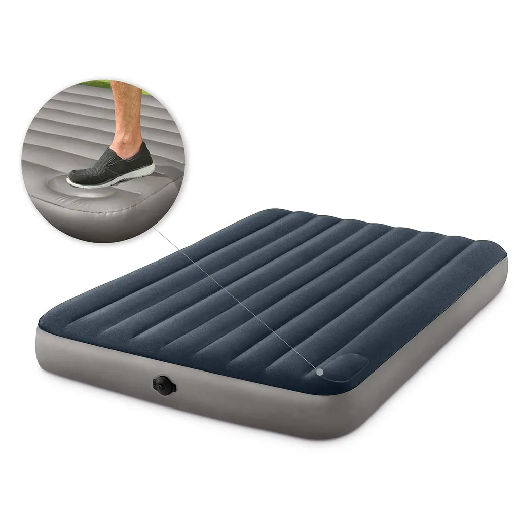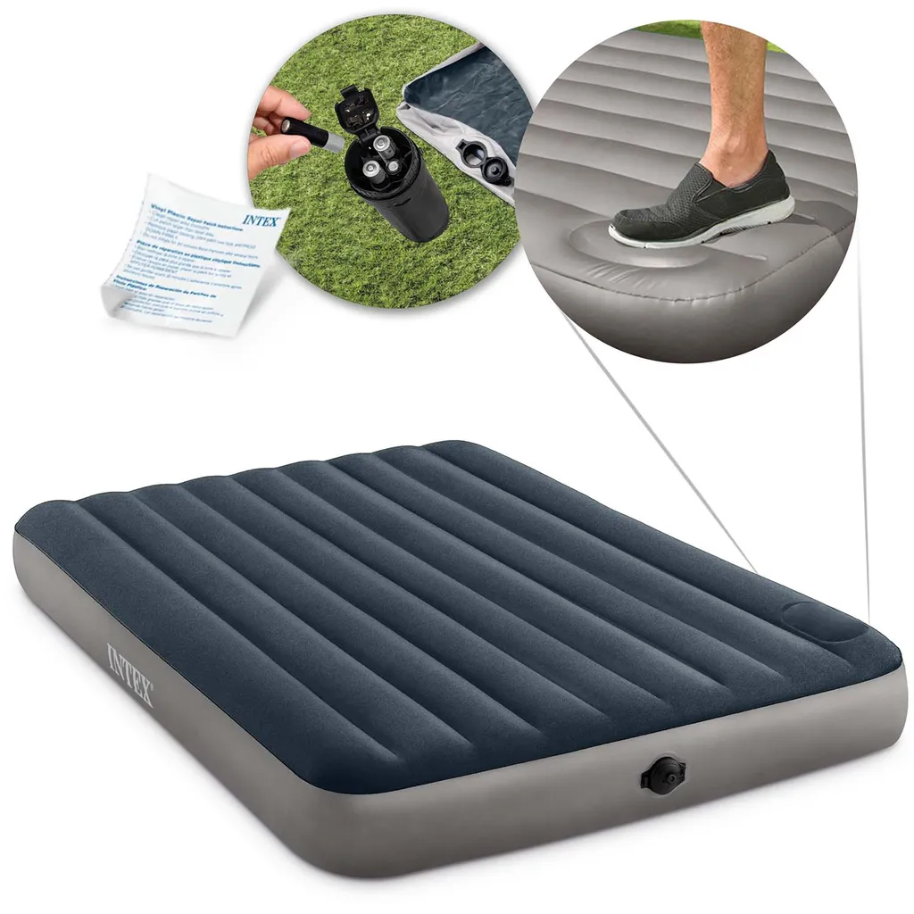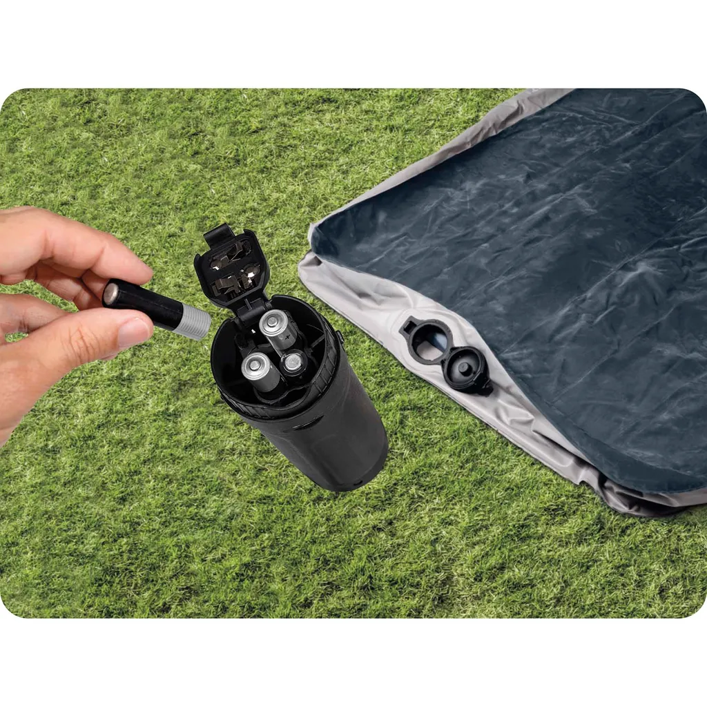 Zur Verwendung beim Campen oder auch als Gästebett. Das große Luftbett der Deluxe Single-High Serie ist das weltweit meistverkaufte Luftbett von INTEX. Eine qualitätsgeprüfte starke, wasserfeste und beflockte Oberseite sowie ein starker Vinyl Boden bzw. Seitenwand sorgen für eine angenehme und vor allem stabile Verwendung. Eine Matratzenhöhe von 25 cm sorgt für extra Komfort. Ein großes 2-in-1-Ventil mit einer extraweiten Öffnung für ein schnelles Aufblasen und Ablassen der Luft ist serienmäßig integriert. Eine unglaubliche Nachtruhe beginnt mit einem einzigen Faden. Luftbetten mit dieser neuen, innovativen und patentierten Fiber-Tech ™ Technologie bestehen aus tausenden hochfesten Polyesterfasern. Fiber-Tech™ Technologie für perfekten Liegekomfort 2-in-1-Ventil mit extraweiten Öffnungen für schnelles Aufblasen und Ablassen 25 cm Matratzenhöhe für extra Komfort für Lagerung und Reisen einfach zu falten Abmessung ca. 152 x 203 x 25 cm 2-in-1-Ventil Max. Belastbarkeit ca. 272 kg Montagezeit ca. 1 min Batterie benötigt 4 Stk. AA-Mignon Batterie