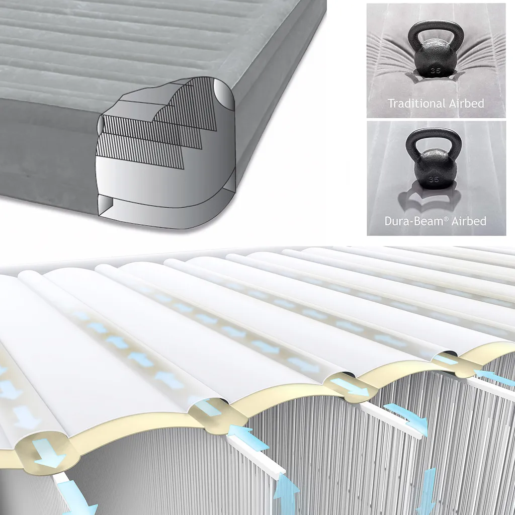 Mit den Comfort Plush Elevated Luftbetten präsentiert Intex die neuste Technologie im Bereich Luftbetten: Dura Beam. Die Innenkonstruktion dieser Luftbetten ist verstärkt mit Polyesterfasern. Dies hat mehrere Vorteile gegenüber herkömmliches PVC-Material. Die Polyesterfasern sind stärker, wiegen weniger und es lässt sich bequemer darauf schlafen. Darüber hinaus ist das Bett komplett ausgestattet. Das Luftbett verfügt über eine eingebaute Motorpumpe, ist hergestellt aus dickem Material und wird geliefert in einer praktischen Tragetasche. Die obere Schicht des Luftbettes besteht aus weichem Material. Die horizontalen Luftkammern sorgen für eine gute Stabilität über das ganze Bett. Mit einer Höhe von 46 Zentimeter ist es komfortable um in und aus dem Bett zu gehen und bekommen Sie das Gefühl auf einer normalen Matratze zu liegen.