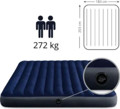 Detalles: Descripción del producto Colchón hinchable gama Dura-Beam Intex para interior y exterior. El tamaño de la cama de aire es tipo King Size, óptimo para dormir cómodamente dos personas. Mide 183 x 203 x 25 cm y soporta hasta 273 Kg. Fabricado en vinilo de gran calidad y resistente al agua, con este colchón tendrás un sueño reparador y confortable. Su estructura acanalada y de tacto suave ofrece gran comodidad, al igual que su construcción interior con tecnología Fiber-Tech de Intex: miles de finas fibras de poliéster extra resistentes que evitan que el colchón se deforme y sea estable, cómodo y firme.UNA CAMA EXTRA LISTA EN MINUTOS Utiliza una bomba manual o eléctrica para hinchar o deshinchar el colchón, lo tendrás listo para usar en 5 minutos aproximadamente. Gracias a la válvula 2 en 1 con boquilla extra ancha, el proceso es fácil y rápido. Tanto si lo usas para viajar como para tener en casa, el colchón hinchable Intex te ofrece grandes prestaciones sin apenas ocupar espacio. Se pliega fácilmente y es ligero, adecuado para el equipaje y para almacenar en casa. El modelo Dura Beam Standard Classic Downy de Intex está disponible en varios tamaños para que elijas el que más se ajusta a tus necesidades. Advertencia de seguridad Se recomienda la vigilancia de un adulto
