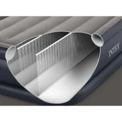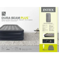 Die Luftmatratze Intex Deluxe Pillow Rest Raised Twin für 1 Person mit den Maßen 99 x 191 x 42 cm ist für den Heimgebrauch geeignet. Die Luftmatratze hat eine Höhe von 42 cm, was das Ein- und Aussteigen besonders einfach macht. Die Luftmatratze hat eine einzigartige Kantenkonstruktion, die für hervorragende Stabilität sorgt. Die Innenseite der Luftmatratze enthält Polyesterfäden, die von der Ober-zur Unterseite der Luftmatratze verlaufen. Diese Tausenden von Fasern sorgen für perfekte Stabilität und revorragende Unterstützung des Körpers. Diese innere Struktur mit unterstützten Dura-Beam-Fasern, auch Fiber-Tech-Technologie genannt, ist ein einzigartiges Merkmal dieser Intex-Luftmatratzen und ein Garant für ein angenehmes Schlaferlebnis. Die Luftmatratze verfügt über eine interne Quickfill Plus-Pumpe, sodass Sie nur den Stecker einstecken und den Knopf auf „+“ drehen müssen, um die Luftmatratze aufzublasen. Um die Luftmatratze nach Gebrauch zu entleeren, drehen Sie den Knopf auf „-“ und die Luftmatratze entleert sich. Die Luftmatratze lässt sich leicht sisammenfalten und Dank der samtigen Liegefläche liegen Sie wunderbar weich. Für zusätzlichen Komfort hat diese Luftmatratze ein eingebautes Kissen.