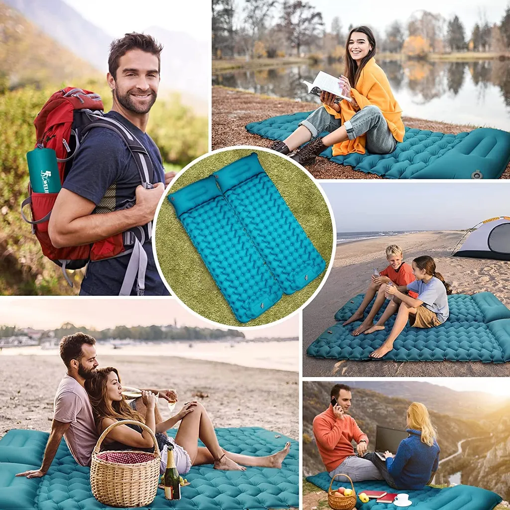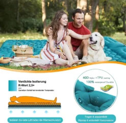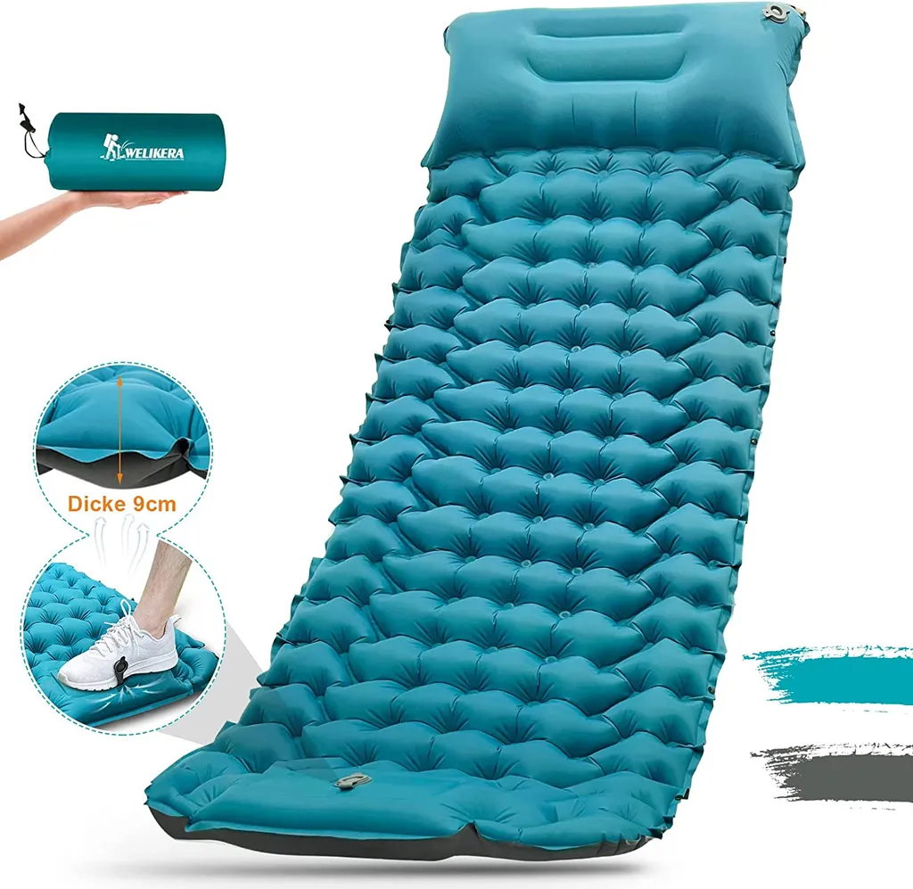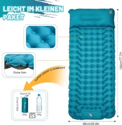 Unsere aufblasbare Schlafmatte ist extrem strapazierfähig, dank des Materials aus 40D Nylon und TPU Polyester, das wasserdicht, abriebfest und reißfest ist und für die meisten Outdoor-Aktivitäten wie Camping, Wandern, Angeln, Radfahren, Jagen usw. geeignet ist Doppel Luftzellenventil Design ist maximal dicht, und Sie brauchen sich keine Sorgen um Lecks zu machen. Mit einem ergonomischen Luftzellen Design auf der Oberfläche und einem eingebauten Kissen können Sie sich bewegen und genießen, selbst wenn Sie liegen, und bieten Ihnen mehr Bewegungsfreiheit Sie haben in jeder Schlafposition den besten Komfort für eine außergewöhnliche Nachtruhe.