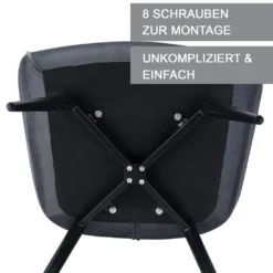 Mit nur acht Schrauben lassen sich Beine und Sitz unkompliziert zusammenbauen. So ist unser Polsterstuhl im Nu aufgebaut und Sie können sich an Ihrer neuen Anschaffung erfreuen, mit einem Buch entspannen oder Familie und Freunde zum gemeinsamen Bestaunen Ihrer trendigen Esszimmerstühle einladen.