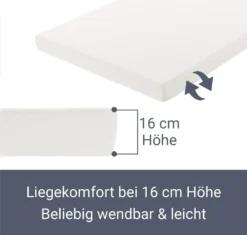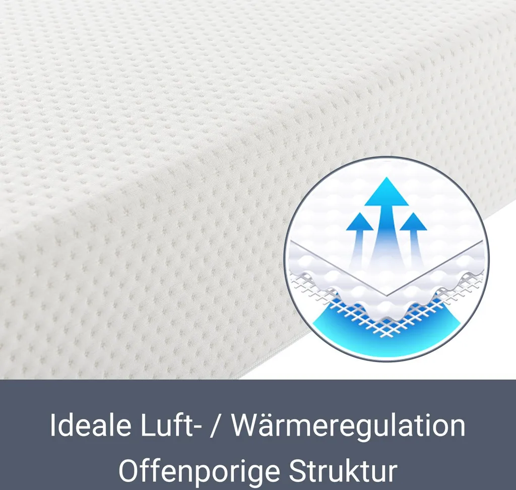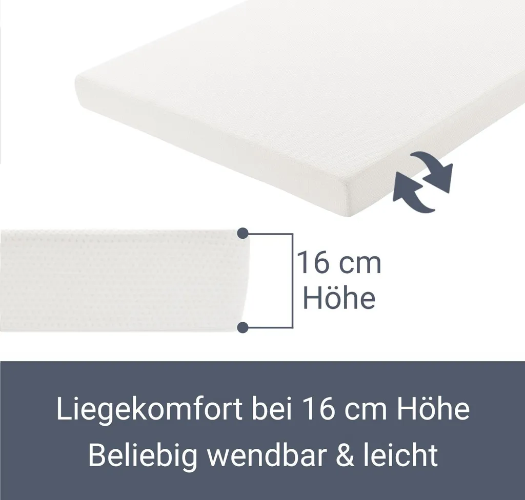 Die komfortable 16 cm hohe H3-Matratze mit verdichtetem Schaumkern passt sich ergonomisch Ihrem Körper an und unterstützt punktelastisch die Wirbelsäule. Die offenporige Kernstruktur der atmungsaktiven Matratze sorgt für ein trockenes Schlafklima. Der abziehbare Polyester-Bezug lässt sich einfach per Hand waschen.
