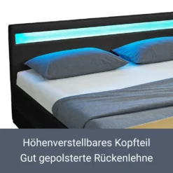 Eine im Kopfteil eingelassene LED-Leiste sorgt für eine stimmungsvolle Atmosphäre im Schlafzimmer. Es stehen Ihnen 16 verschiedene Farbeinstellungen zur Verfügung, die Sie bequem per Fernbedienung kontrollieren. Dank der indirekten Beleuchtung können Sie selbst auf eine Nachttischlampe verzichten.