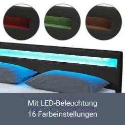 Eine im Kopfteil eingelassene LED-Leiste sorgt für eine stimmungsvolle Atmosphäre im Schlafzimmer. Es stehen Ihnen 16 verschiedene Farbeinstellungen zur Verfügung, die Sie bequem per Fernbedienung kontrollieren. Dank der indirekten Beleuchtung können Sie selbst auf eine Nachttischlampe verzichten.
