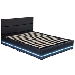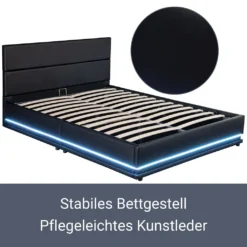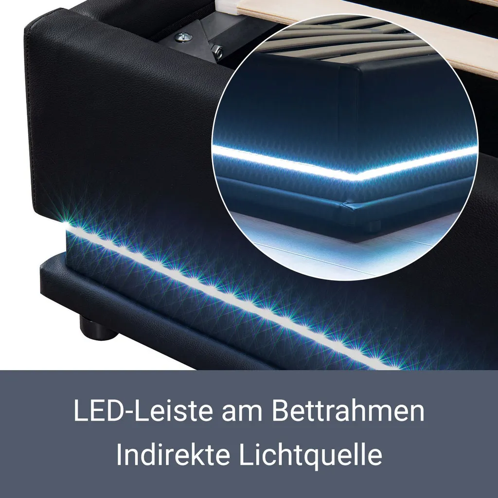 Das LED-Polsterbett Toulouse (140×200 cm, schwarz) ist ein geräumiges Einzel- oder Jugendbett mit Lattenrost, Matratze und viel Stauraum. Auf dem stabilen Lattenrost und der ergonomischen Kaltschaummatratze liegen Sie ideal, um gesund und erholsam zu schlafen. Zudem befindet sich in dem darunter liegenden Bettkasten viel Platz fĂĽr Bettwäsche. Das Kunstlederbett mit modern-schlichtem Design wird zweifellos der neue Blickfang in Ihrem Gäste- oder Schlafzimmer. Im Bettrahmen befindet sich zudem eine LED-Leiste in Bodennähe, die sich ĂĽber beide Seiten und das FuĂźende streckt.