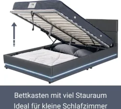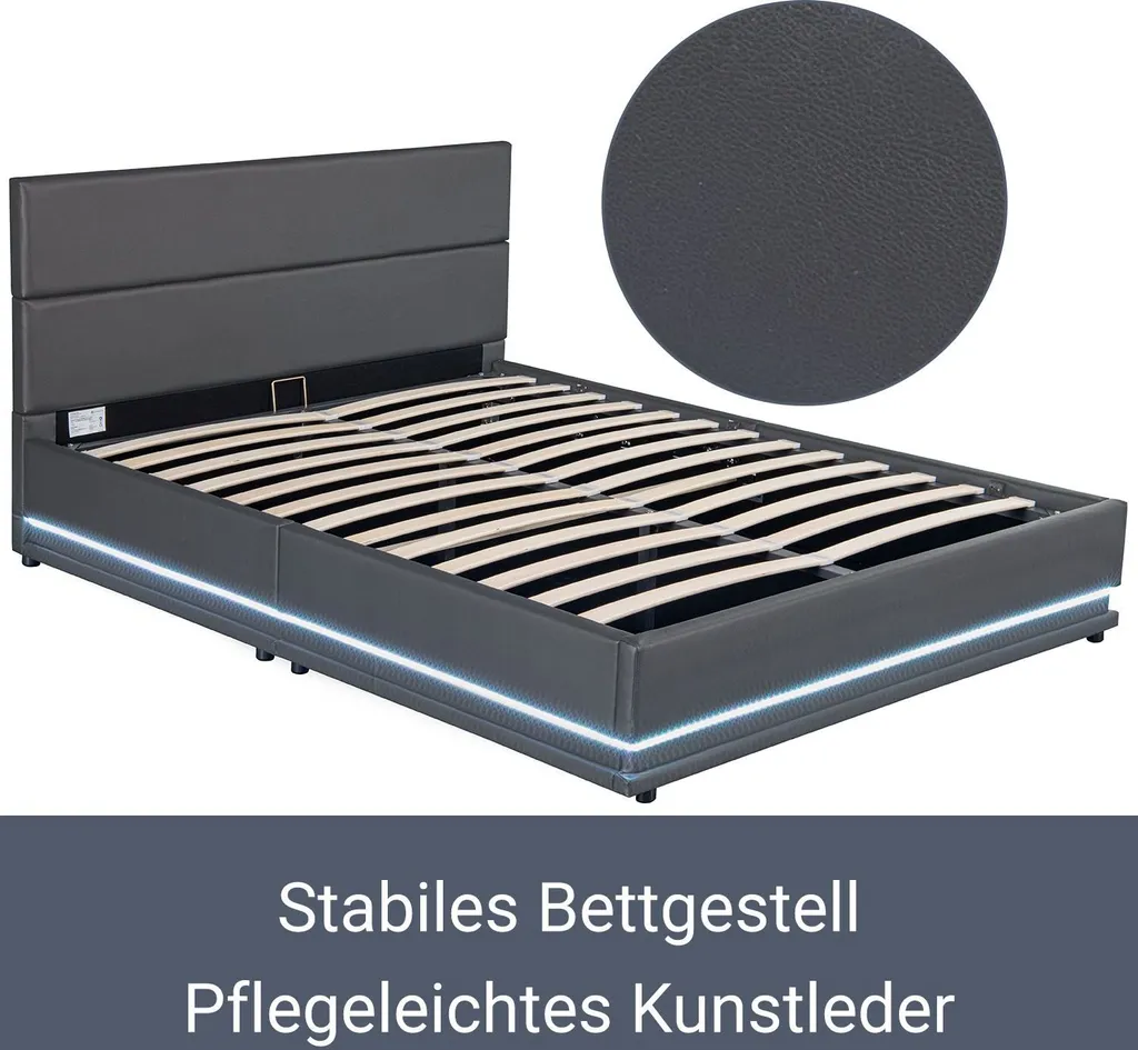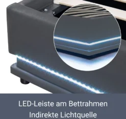 Das LED Polsterbett Toulouse (140×200 cm, dunkelgrau) ist ein geräumiges Einzel- oder Jugendbett mit Lattenrost und viel Stauraum. Auf dem stabilen Lattenrost liegen Sie ideal, um gesund und erholsam zu schlafen. Zudem befindet sich in dem darunter liegenden Bettkasten viel Platz fĂĽr Bettwäsche. Das Kunstlederbett mit modern-schlichtem Design wird zweifellos der neue Blickfang in Ihrem Gäste- oder Schlafzimmer. Im Bettrahmen befindet sich zudem eine LED-Leiste in Bodennähe, die sich ĂĽber beide Seiten und das FuĂźende streckt.