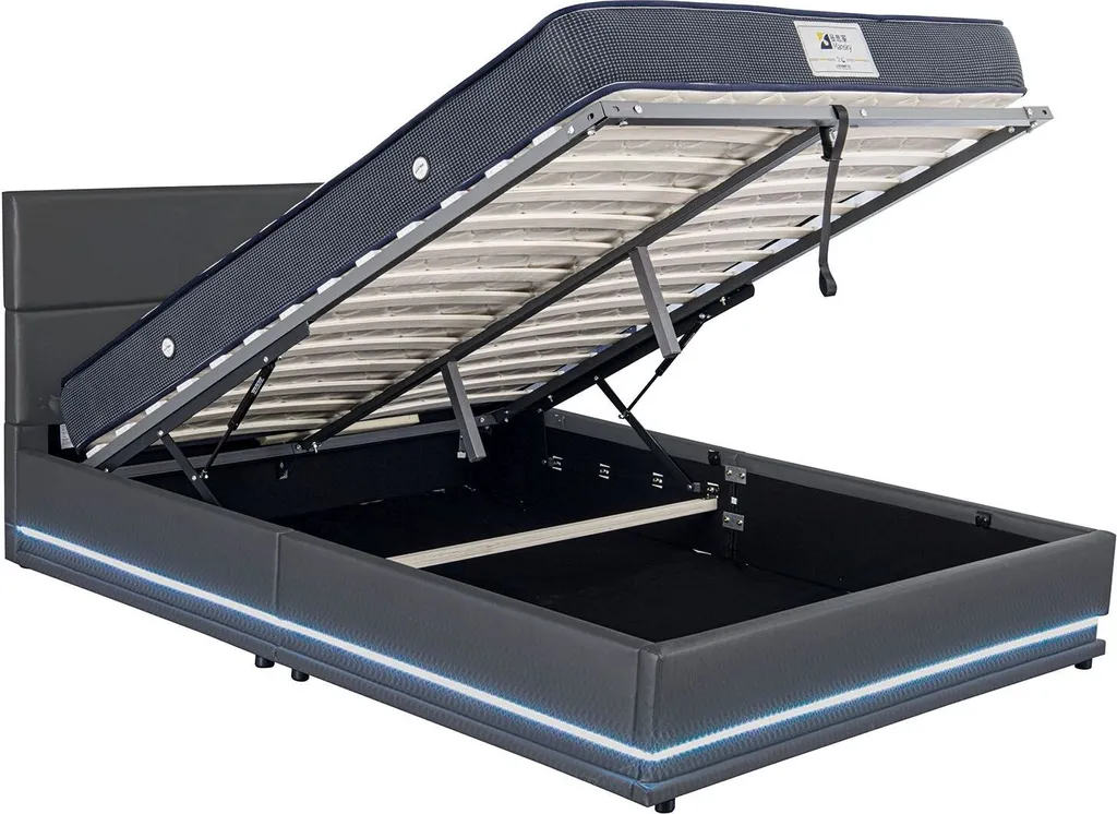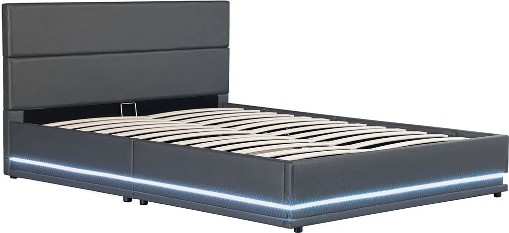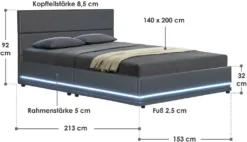 Um den Bettrahmen herum verläuft eine LED-Leiste, die in einem wunderschönen weißen Licht leuchtet. Durch die indirekte Lichtquelle scheint das Bett zu schweben und sie können sich im abgedunkelten Schlafzimmer immer noch gut orientieren.