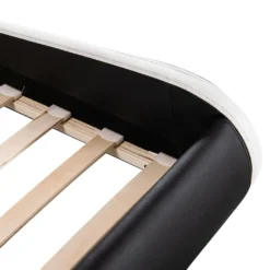 Der 149,5 x 223 cm große Bettrahmen aus Holz und Metall wird zum Mittelpunkt Ihres Schlaf- oder Gästezimmers. Er ist als großzügiges Einzelbett oder raumsparendes Doppelbett verwendbar und gut gepolstert. Der Kunstlederbezug lässt sich spielend einfach mit einem feuchten Tuch reinigen.