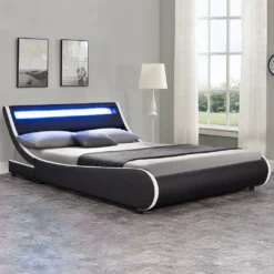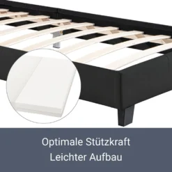 Der hölzerne Bettrahmen ist bequem gepolstert, äußerst stabil und schnell zusammengebaut. 8 cm hohe Stützfüße sorgen für zusätzliche Standfestigkeit. Der weiche Bezug aus Kunstleder lädt zum Wohlfühlen ein. Er lässt sich kinderleicht mit einem feuchten Tuch reinigen.