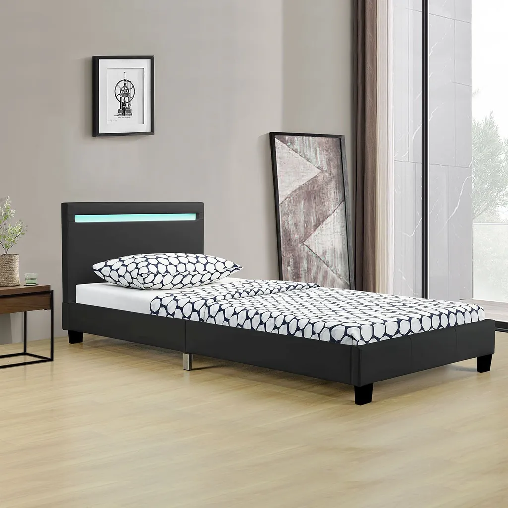Das gemütliche Polsterbett Verona (schwarz) mit LED-Beleuchtung, Lattenrost und Matratze ist der optimale Erholungsort für guten und gesunden Schlaf. Mit der 90 × 200 cm großen Liegefläche bietet das bequeme Einzelbett Kindern, Teenagern wie auch alleinstehenden Erwachsenen reichlich Platz. Die wendbare und wärmeregulierende Kaltschaum-Matratze passt sich dabei ergonomisch Ihrem Körper an. Der schlichte Bezug verleiht dem Kunstlederbett eine moderne Optik, die sich nahtlos in viele Kinder-, Gäste- oder Schlafzimmer einfügt. Das charmante Möbelstück eignet sich ideal zum Ausruhen und Kraft tanken.