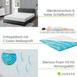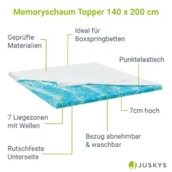 Steigern Sie mit dem 7-Zonen Topper 140×200 cm (7 cm hoch) Ihren Liegekomfort – wichtig für einen tiefen, erholsamen und gesunden Schlaf. Der Matratzenschoner bietet Ihnen ein traumhaftes Liegegefühl und vereint viele Vorteile. Die Druckentlastung des Körpers fördert die Durchblutung, was Verspannungen, Gelenk- und Rückenproblemen vorbeugt. Oder optimieren Sie Ihre bisherige Matratze mit dem Topper und schlafen Sie wieder besser. Machen Sie eine harte Matratze bequemer und verwandeln Sie diese in eine rückenschonende Schlafoase. Sonst dient der Matratzentopper zum Schonen Ihrer Matratze oder zur Überwindung der Bettlücke zwischen zwei Matratzen.