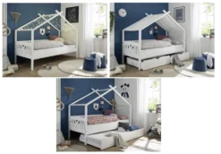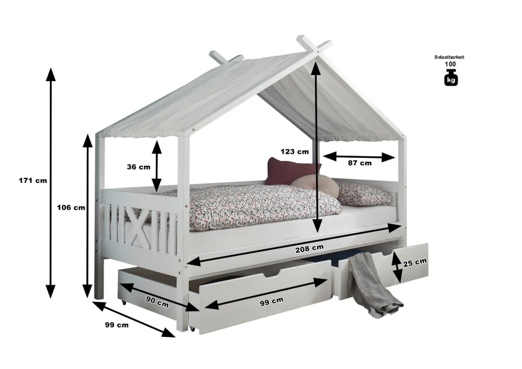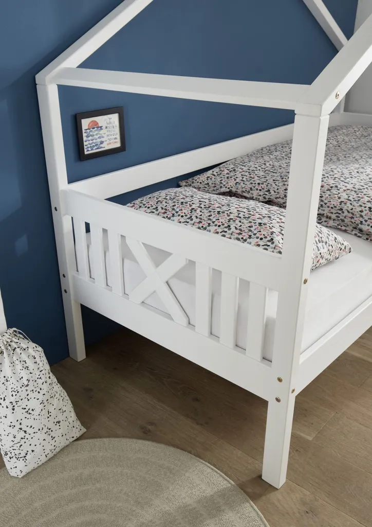 Das Pfostenbett Emma mit Dach und Himmelvorrichtung ist eine optimale Lösung als Schlafgelegenheit für ihr Kind und lädt zum Träumen ein. Tagsüber ein Sofa und nachts eine verwandelbare Schlafgelegenheit. Durch die hohen Seitenteile und einer durchgehenden Rückenleiste lassen sich tagsüber schöne, kuschelige Kissen platzieren. Ein durchgehend massives Kiefernbett in weiß, zeitlos und geradlinig zugleich. Wann schläft Ihr Kind oder Ihr Besuch die erste Nacht in diesem wunderschönen Himmelbett ?