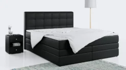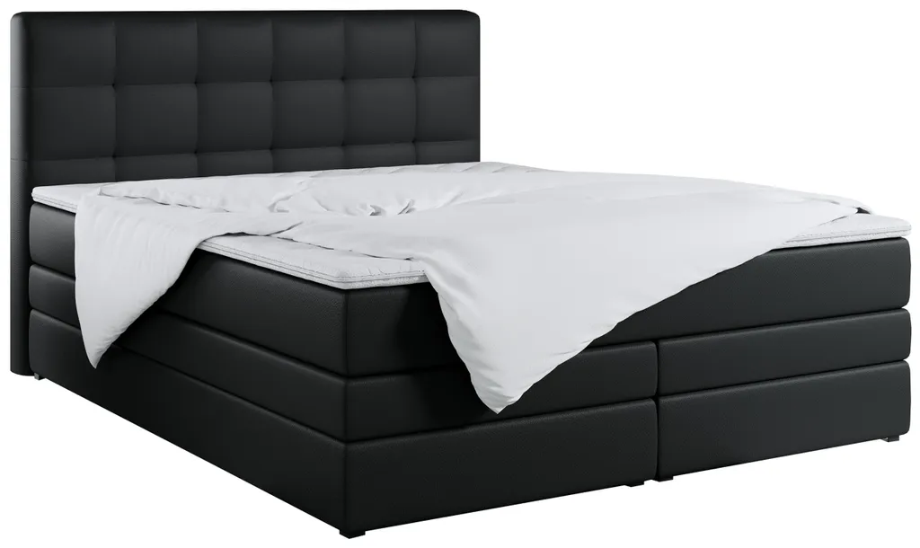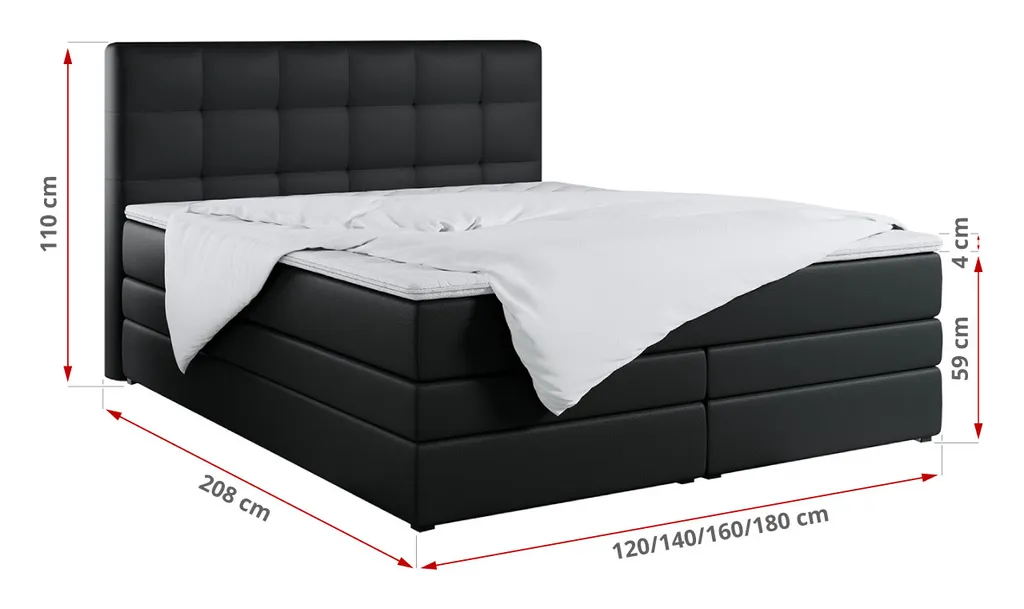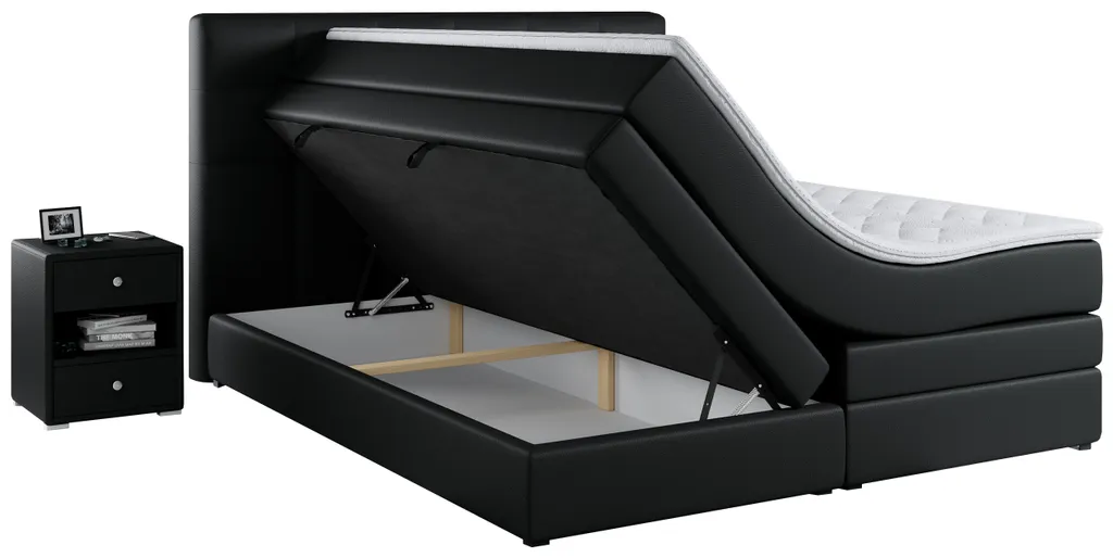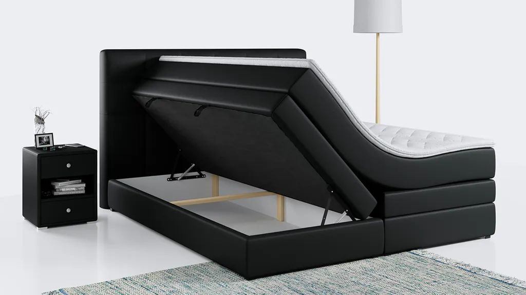 Das Boxspringbett mit mehreren Aufbewahrungsmöglichkeiten ist aus stabilen und extrem langlebigen Materialien gefertigt und wird standardmäßig mit einem doppelten Aufbewahrungskasten und einer PREMIUM-Matratze geliefert. Ebenfalls enthalten ist eine 6 cm dicke Auflage, die nicht nur das Bett schützt, sondern auch den Schlafkomfort erhöht.