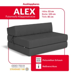 Das Futonsofa ALEX ist ein bequemes und funktionelles ausklappbares Sofa, welches als Matratze wie auch als Sessel genutzt werden kann. Diese Faltmatratze ist eine einfache und doch elegante Alternative zu einem vollwertigen Schlafsofa. Ein dreifach gefaltetes Sofa ist eine gute Wahl, um etwas Platz zu sparen.