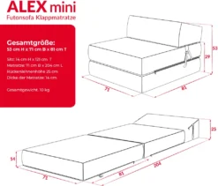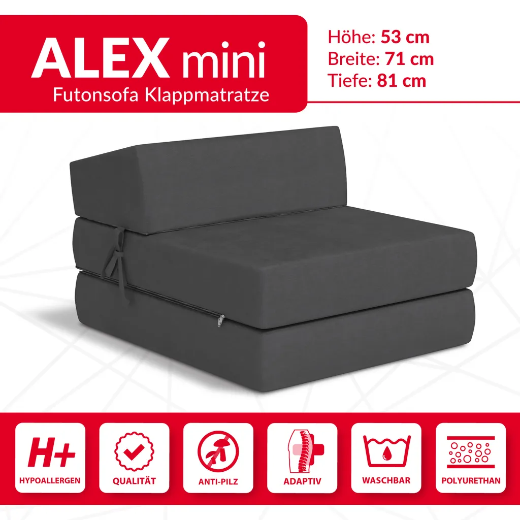 Das Futonsofa ALEX ist ein bequemes und funktionelles ausklappbares Sofa, welches als Matratze wie auch als Sessel genutzt werden kann. Diese Faltmatratze ist eine einfache und doch elegante Alternative zu einem vollwertigen Schlafsofa. Ein dreifach gefaltetes Sofa ist eine gute Wahl, um etwas Platz zu sparen.