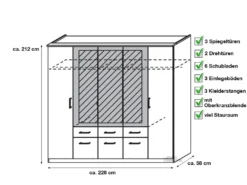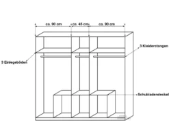 Die Fronten des Schrankes erstrahlen in einem schlichten weiß, während die Schranktüren mit grauen Absetzungen versehen sind. Durch die alufarbenen Griffe wird das Öffnen und Schließen vereinfacht und das Erscheinungsbild vollendet. Hinter den Drehtüren finden Sie auf 3 Einlegeböden und 3 Kleiderstangen genügend Stauraum. In den 6 Schubladen können Sie außerdem neben Ihrer Unterwäsche weitere Schlafutensilien wie Decken und Co. verstauen.