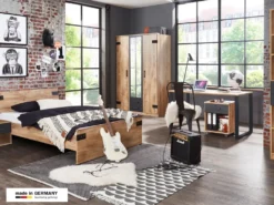 Die Fronten des Schrankes erstrahlen in einem schlichten weiß, während die Schranktüren mit grauen Absetzungen versehen sind. Durch die alufarbenen Griffe wird das Öffnen und Schließen vereinfacht und das Erscheinungsbild vollendet. Hinter den Drehtüren finden Sie auf 3 Einlegeböden und 3 Kleiderstangen genügend Stauraum. In den 6 Schubladen können Sie außerdem neben Ihrer Unterwäsche weitere Schlafutensilien wie Decken und Co. verstauen.