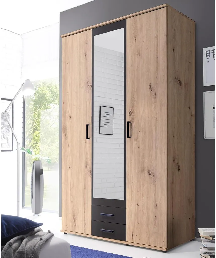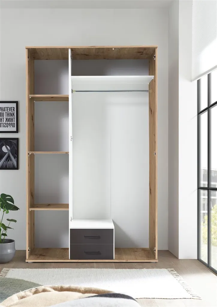 Der Kleiderschrank „Cilli I“ ist vornehmer Artisan Eiche Nachbildung erhältlich, welche stilsicher mit Absetzungen in elegantem Anthrazit kombiniert wird. Diese attraktive Farbkombination schafft im jeweiligen Raum nicht nur eine edlere Atmosphäre, sondern verleiht diesem auch eine stilvolle Erscheinung. Die Holznachbildung wirkt besonders realistisch und ist von echter Eiche kaum zu unterscheiden.
