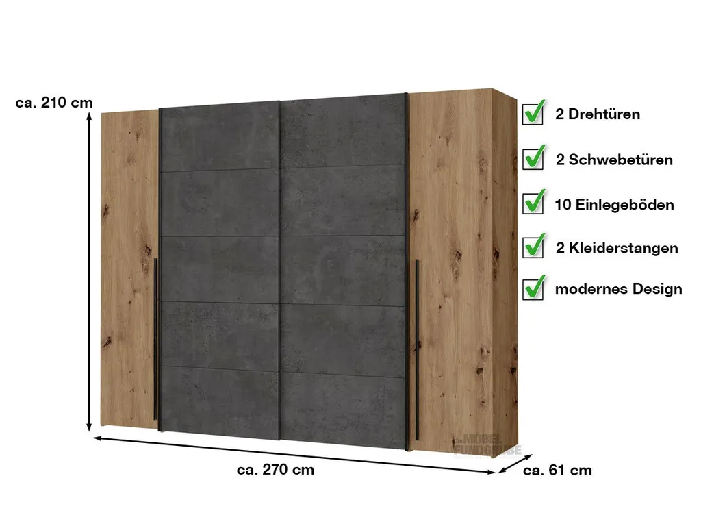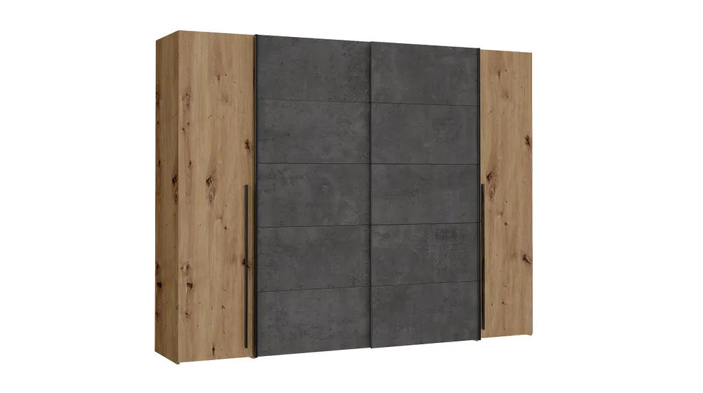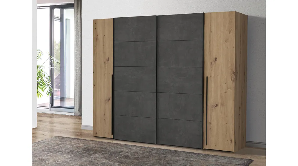 Der Kleiderschrank NARAGO ist mit 2 Drehtüren und 2 Schwebetüren ausgestattet. Die Front ist in einem warmen Artisan EicheNachbildung in Kombination mit grau gehalten. Die schwarzen Griffleisten runden das Gesamtbild optisch ab. Der Kleiderschrank bietet ingesamt 10 Einlegeböden und 2 Kleiderstangen. Mit einer Breite von ca. 270 cm haben Sie genügend Stauraum, um all Ihre Kleidung zu verstauen.