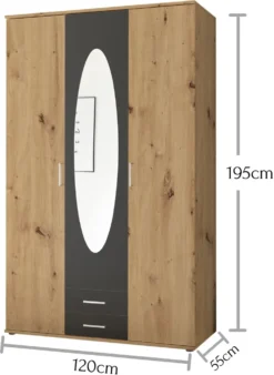 Der Kleiderschrank vereint funktionale Ansprüche mit Liebe zum Design. Optisch überzeugt der Drehtürenschrank mit seiner klaren Formgebung und der harmonischen Farbkombination. Ein ovaler Spiegel, der die Mitte des Schranks ziert, ergänzt die Optik. Trotz des markanten Designs fügt er sich problemlos in verschiedene Einrichtungsstile und Räume ein. Dabei ist es egal, ob er im Schlafzimmer, im Kinderzimmer oder im Gästezimmer platziert wird.In punkto Funktionalität hat der Kleiderschrank aber auch noch einiges zu bieten. Die raffinierte Unterteilung des Innenlebens sorgt für ausreichend Platz und Ordnung. Hinter seinen Türen verbirgt er mehrere Einlegeböden, die den Stauraum flexibel einteilen. An der Kleiderstange lassen sich Kleidungsstücke knitterfrei aufhängen. Zwei geräumige Schubladen verstauen Kleinigkeiten.