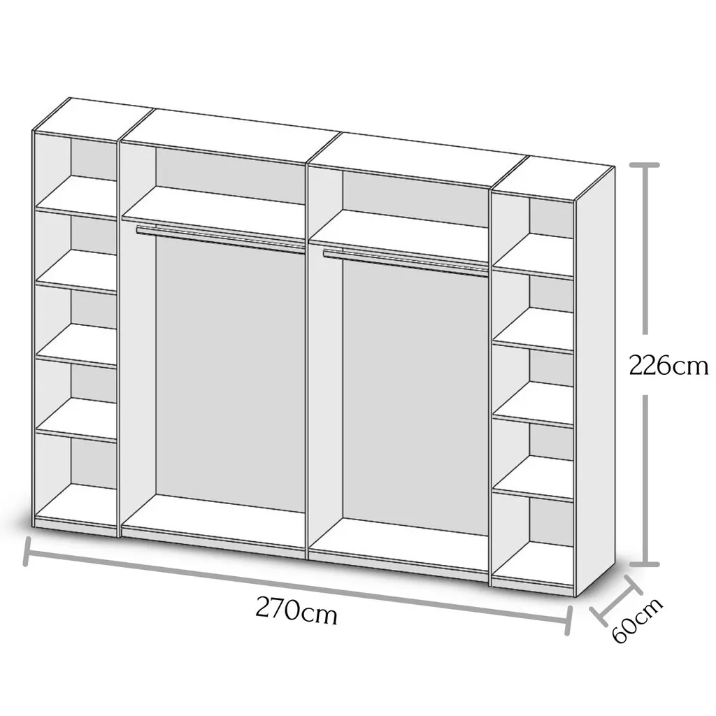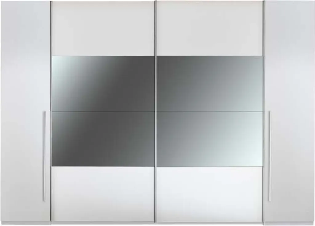 Der zeitlose Dreh- und Schwebetürenschrank bietet sehr viel Platz und überzeugt durch sein schlichtes Design. Der Kleiderschrank verfügt außerdem über diverse Besonderheiten: Bei den äußeren Türen handelt es sich um Drehtüren, während innen liegende Türen mit einer Schwebefunktion und großflächigen Spiegeln ausgestattet sind. Hinzu kommen viele Fächer und eine Kleiderstange, die für hohen Komfort und ein Plus an Funktionalität sorgen. Der moderne Schrank vereint eine ansprechende Optik mit hilfreichen Funktionen und wird im Schlafzimmer zum Hingucker. Im Paket enthalten sind: 1x Schwebetüren-Schrank inkl. Einlegeböden, Kleiderstange und Montage-Material.