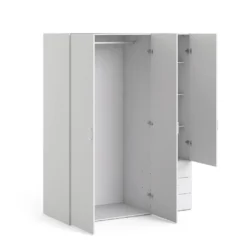 Praktischer und funktionaler Kleiderschrank mit drei Flügeltüren und drei Schubladen, innen und außen ganz in Weiß, ausgestattet mit eleganten und einfachen Griffen, die das Öffnen erleichtern.