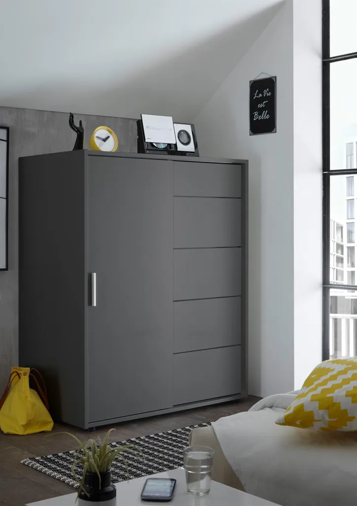Der vielseitige Kleiderschrank ist ein funktionales Stauraumelement für das Schlafzimmer. Hinter 1 Holztür besticht er dank 1 großzügigen Kleiderstange. Hier ist für jede Menge Aufhängungsmöglichkeiten für Jacken, Mäntel und Co bestens gesorgt. Auch 5 großzügige Schubkästen wissen mit Stauraum nicht zu geizen. Der Oberboden bietet nicht nur eine nützliche Ablagefläche, sondern lädt zum Dekorieren geradezu ein. „Case III“ ist so konzipiert, dass auch in den kleinsten Schlafzimmern mehr als ausreichend Platz für Kleidung geschaffen wird.