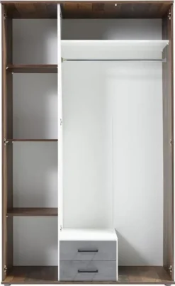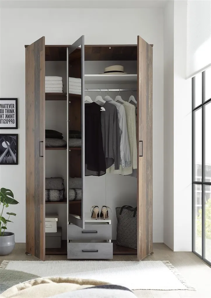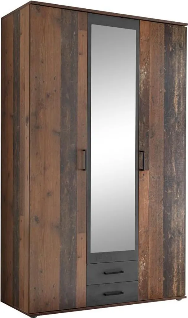 Mit diesem modernen Kleiderschrank lässt sich jedes Jugend- oder Schlafzimmer geschmackvoll einrichten. Dieser attraktive Kleiderschrank inklusive Spiegelelement auf der Mitteltür repräsentiert einen zeitlosen Einrichtungsstil. In den Schubkästen und hinter den Schranktüren gibt es viel Stauraum für Kleidungsstücke und andere Dinge. Der angesagte Kleiderschrank ist praktisch geeignet für jede Jugend-/Schlafzimmereinrichtung oder für die erste eigene Wohnung. Im Paket enthalten sind: 1x Drehtüren-Schrank (dreitürig) inkl. Einlegeböden, Kleiderstange und Montage-Material.