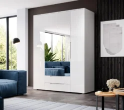 Dank seiner Farbgebung in Weiß/Weiß-Hochglanz verleiht der Kleiderschrank „Suzette IV“ dem Schlafzimmer eine frische Ausstrahlung. Das Spiegelglas ist obligatorisch und rundet das optische Erscheinungsbild des Kleiderschrankes nicht nur ab, sondern wertet dieses sogar auf.