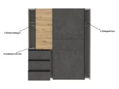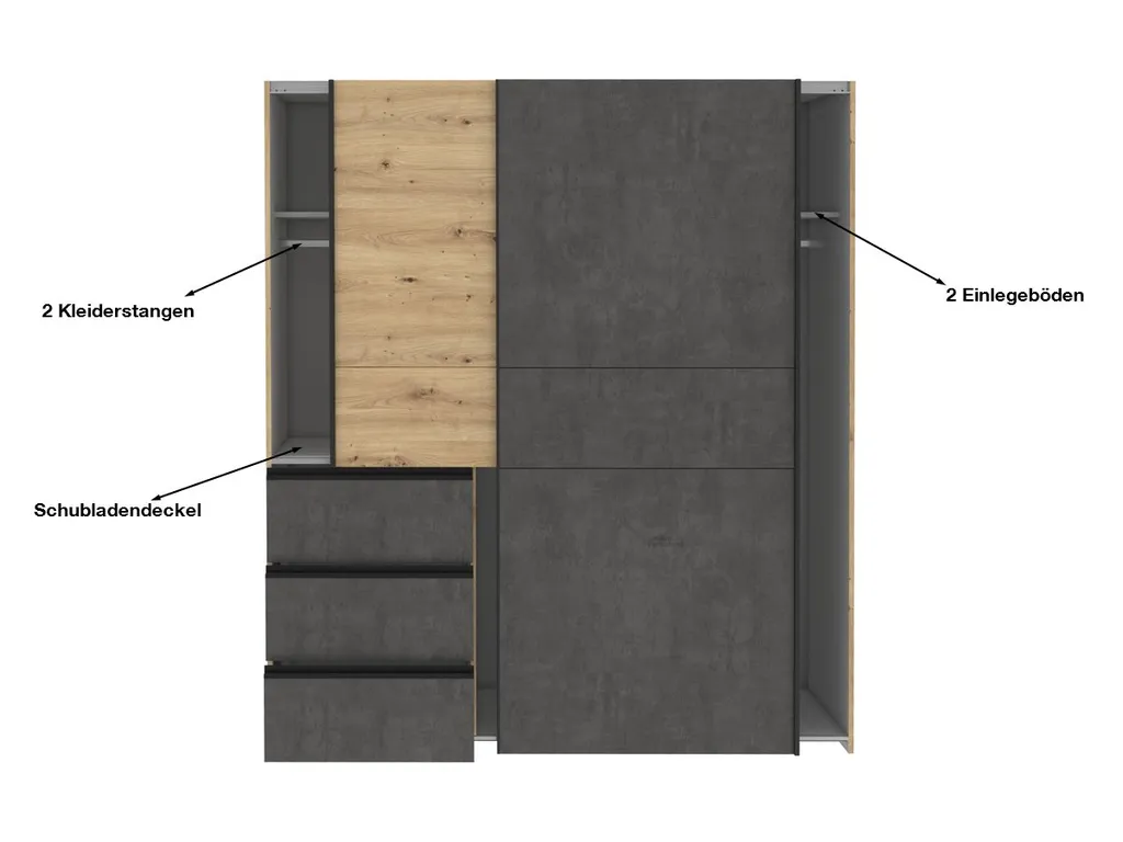 Die Front erstrahlt in warmer Artisan Eiche und dark grey. Auf der gesamten Länge von ca. 170 cm erwarten Sie zwei große Schwebetüren und 3 Schubladen, die Sie für die unterschiedlichsten Kleidungsstücke sowie Ihre Bettwäsche und Co. befüllen können. Dank der integrierten Kleiderstangen und den Einlegeböden sorgen sie im Handumdrehen für Ordnung in Ihrem neuen Kleiderschrank.