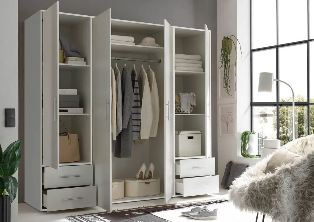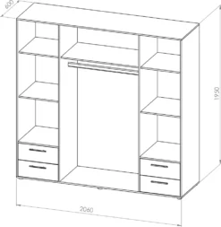 Der Kleiderschrank vereint funktionale Ansprüche mit Liebe zum Design. Optisch überzeugt der Drehtürenschrank mit seiner klaren Form- und Farbgebung. Durch das puristische Design fügt er sich nahtlos in verschiedenste Einrichtungsstile und Räume ein. Dabei ist es egal, ob er im Schlafzimmer, im Kinderzimmer oder im Gästezimmer platziert wird.In punkto Funktionalität hat der Schrank aber auch noch einiges zu bieten. Er besteht aus drei geräumigen Elementen, die raffiniert unterteilt sind und für viel Stauraum und Ordnung sorgen. Das linke und das rechte Element sind identisch aufgebaut und jeweils mit zwei Einlegeböden und zwei Schubkästen versehen. Das mittlere ca. 100 cm breite Element ist mit einer Kleiderstange und einem Einlegeboden ausgestattet. Lieferumfang:-1x Kleiderschrank 206 x 195 x 60 cm (B/H/T)-1x Montage Material und detaillierte Aufbauanleitung