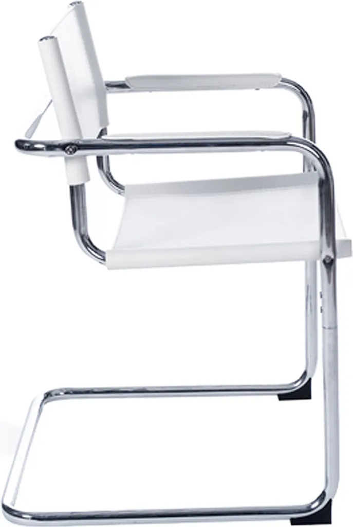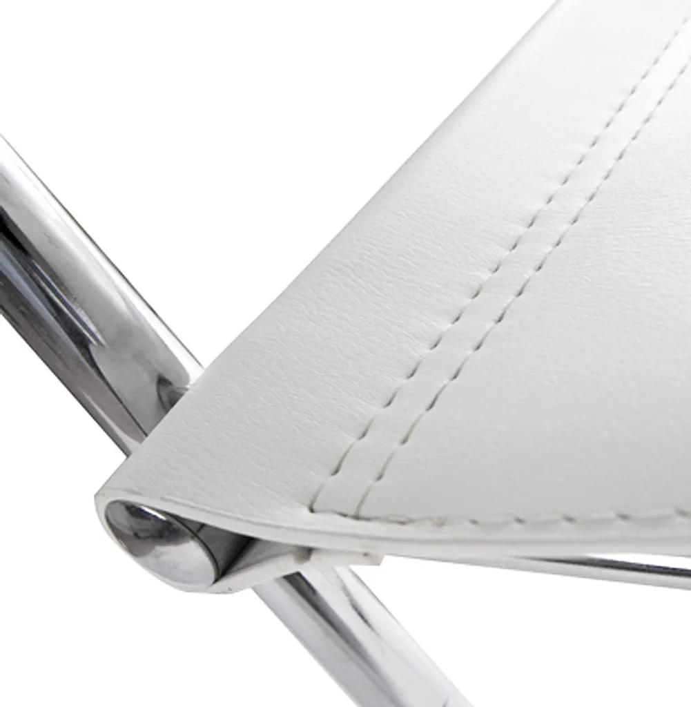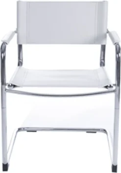 Chic Retro Look und zeitloses Design. Der „Willkommens“ -Stuhl ist mehrfach eingesetzt und für alle Arten von Innenräumen geeignet. Seine selbsttragende Chromstahlstruktur unterstützt einen Sitz in hartem Kunstleder und bietet Komfort und einfache Pflege.