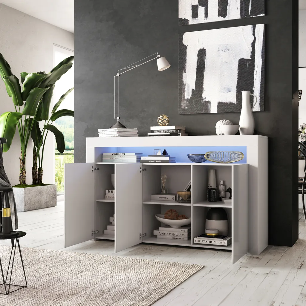 Moderne, funktionale Kommode. Seine einfache Form ermöglicht es Ihnen, sich an alle Innenräume anzupassen. Es verfügt über drei abschließbare Kammern, die in zwei Ebenen unterteilt sind, und ein geräumiges Regal, das von LED-Licht beleuchtet wird.