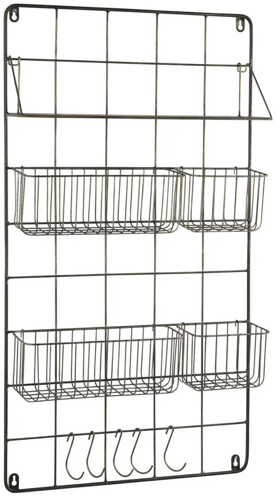 Das Regal hat 4 Körbe, 5 Haken und eine Ablage.
