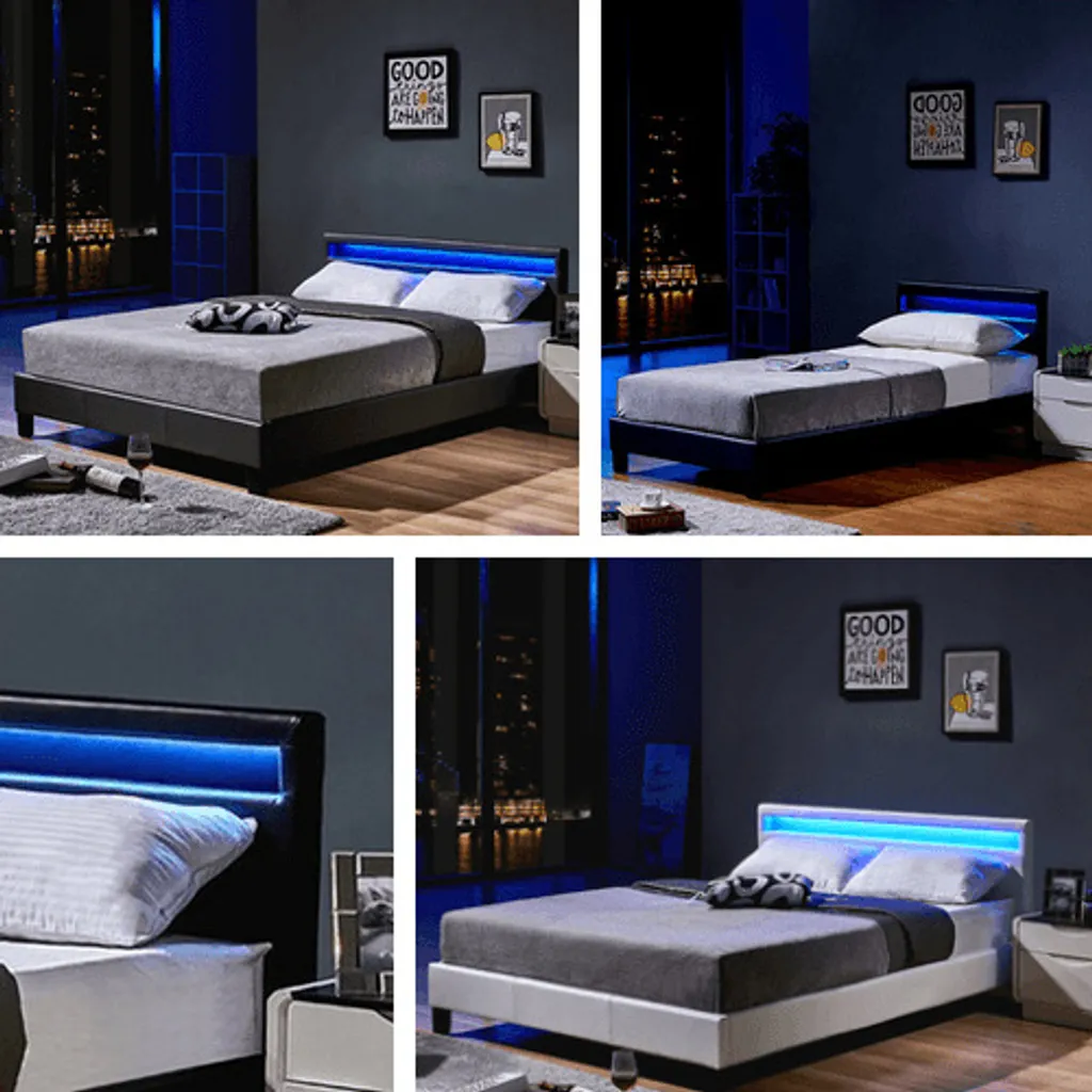 Unsere neue Bettenkollektion bietet Erholung pur. Ganz nebenbei erhalten Sie mit diesem markanten und modernen Möbelstück einen völlig neuen Look. Jetzt nicht mehr! Mit der Home Deluxe Bettenserie sind Design und Funktionalität perfekt aufeinander abgestimmt. Die Lattenroste sind stabil ausgeführt und passen vom Lattenabstand zu allen handelsüblichen Matratzen. Die im Kopfteil enthaltene LED-Lichtleiste kann über eine Fernbedienung nach Farben, Farbwechsel, Helligkeit und Ihren persönlichen Vorlieben angepasst werden. Stellen Sie die Atmosphäre des Raumes ganz nach Ihren Wünschen ein. Der Bezug von Kopf, Seiten- und Fußteil besteht aus strapazierfähigem und pflegeleichtem Kunstleder. Die ausgewählte Form und Farbgebung verleihen Ihrer Schlafstätte einen besonderen und einzigartigen Charakter.