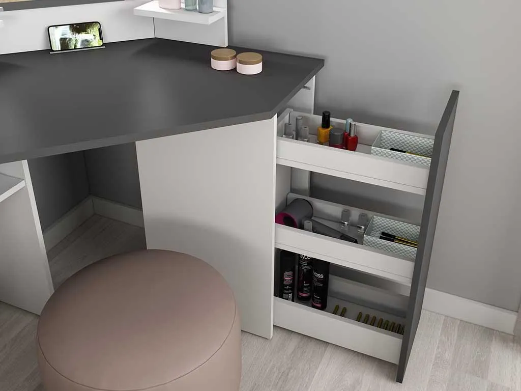 Der Schminktisch CHARLENE zeichnet sich durch seine schlichten, eleganten Farben und die zahlreichen Staufächer aus!