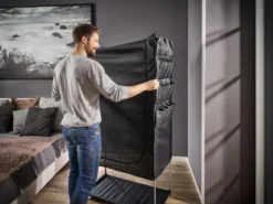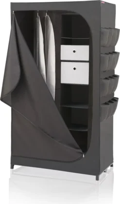 Der Leifheit Flex Kleiderschrank ist ein wahres Raumwunder und überzeugt mit hoher Standfestigkeit und Langlebigkeit. Ob Ski-, Wander- oder Strandbekleidung, ob Jacken, Kleider, Hosen, Accessoires oder Schuhe: Der Flex Schrank bietet mit seinem geräumigen Innenleben, der soliden Kleiderstange und 16 superpraktischen, seitlich angebrachten Außentaschen enorm viel Platz. Dabei steht er selbst voll beladen absolut stabil und fest. Denn ausgestattet ist die mobile Schranklösung mit einem robusten Gestell mit verstärkten Steckverbindungen, einem rückseitigen Stabilitätskreuz und einem Spannboden. Auch der mehrlagige, engmaschig gewebte Stoff erhöht die Standfestigkeit. Zugleich schützt er den Inhalt gut vor Staub und Schmutz, ist atmungsaktiv und abwaschbar. Schnell öffnen und schließen lässt sich der Kleiderschrank mit einem leichtgängigen, langlebigen Reißverschluss. Wer möchte, kann das Platz problemlos ergänzen. Ob Hängeregal, Boxen in Groß und Klein, Vakuumbeutel oder Kleiderhüllen – mit dem Leifheit Combi-System lässt sich der Schrank jederzeit individuell erweitern. Und wird er für eine Saison nicht , ist er schnell zusammengefaltet und platzsparend verstaut.