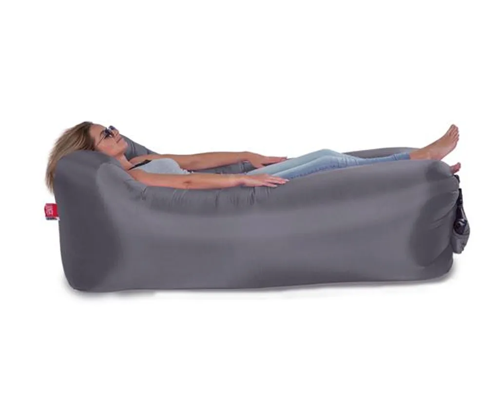 LOUNGER TO GO® ca. 240 x 70 cm ohne Luft, ca. 180x75x60 cm mit Luft gefüllt. Blitzschnell befüllt. Material: 210T Ripstop Polyester, Farbe grau. Maximale Tragfähigkeit 120kg.
