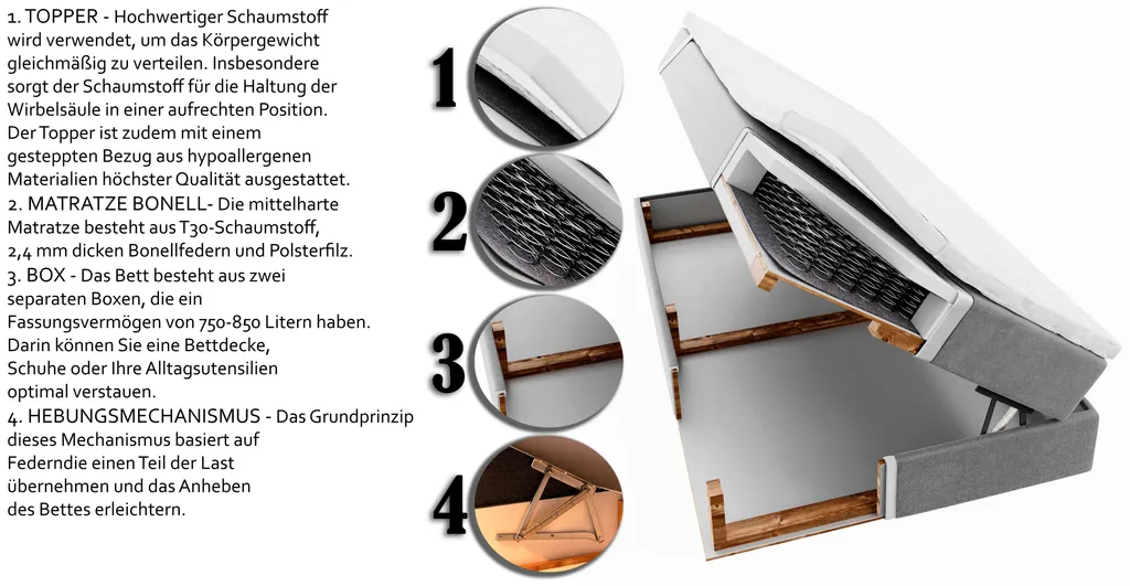 Box – Das Bett besteht aus zwei separaten Boxen, die ein Fassungsvermögen von 750-850 Litern haben.