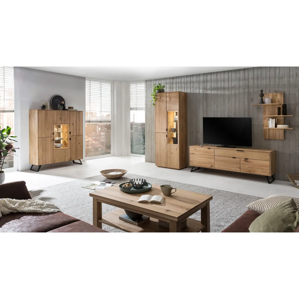 Moderne Möbel mit kleinen Überraschungen – das bietet die Wohn- / Esszimmer Serie LESKO-52. Die massive Wildeiche ist bianco geölt, der leicht milchige Ton bringt Heiterkeit in die solide Optik. Die schräg gestellten Füße von Highboard und Lowboard ergänzen wunderbar das Massivholz und machen die Möbel zu einem Hingucker. Den absoluten Eyecatcher stellen die in den offenen Fächern sichtbaren Steinrückwände dar, die mit der Beleuchtung besonders in Szene gesetzt werden. Sie mögen keine Steinrückwände? Kein Problem, wer einen einheitlichen Look bevorzugt, lässt diese einfach weg. Die Möbel bieten nicht nur viel Ablagefläche sondern auch dekorative Präsentationsfläche.