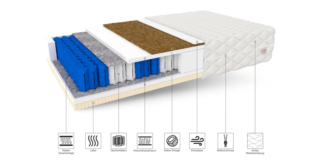 - KOKOSFASERN werden häufig als Matratzeneinlage verwendet. Es ist ein natürlicher Bestandteil, der sich durch seine Haltbarkeit und Langlebigkeit auszeichnet. Kokosnuss ist einerseits elastisch und andererseits etwas steif. Daher wird es häufig verwendet, um die Oberfläche der Matratze zu härten. Aufgrund der guten Luftzirkulation ist er für Allergiker geeignet.