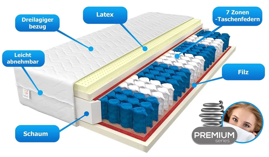 LATEX – antibakteriell und für Allergiker geeignet, die optimale Temperatur des Latex gewährleistet eine gute Verdunstung der Körperfeuchtigkeit, bietet eine perfekte Druckentlastung und passt sich Ihrem Körper optimal an
