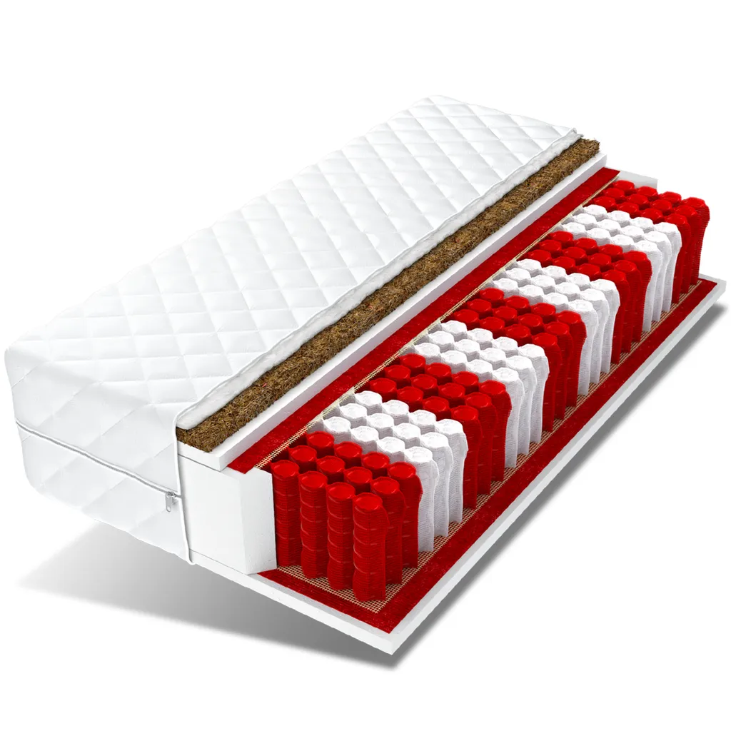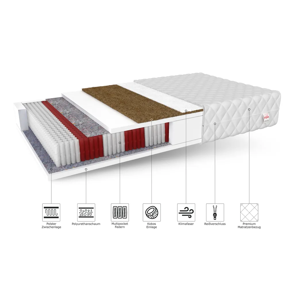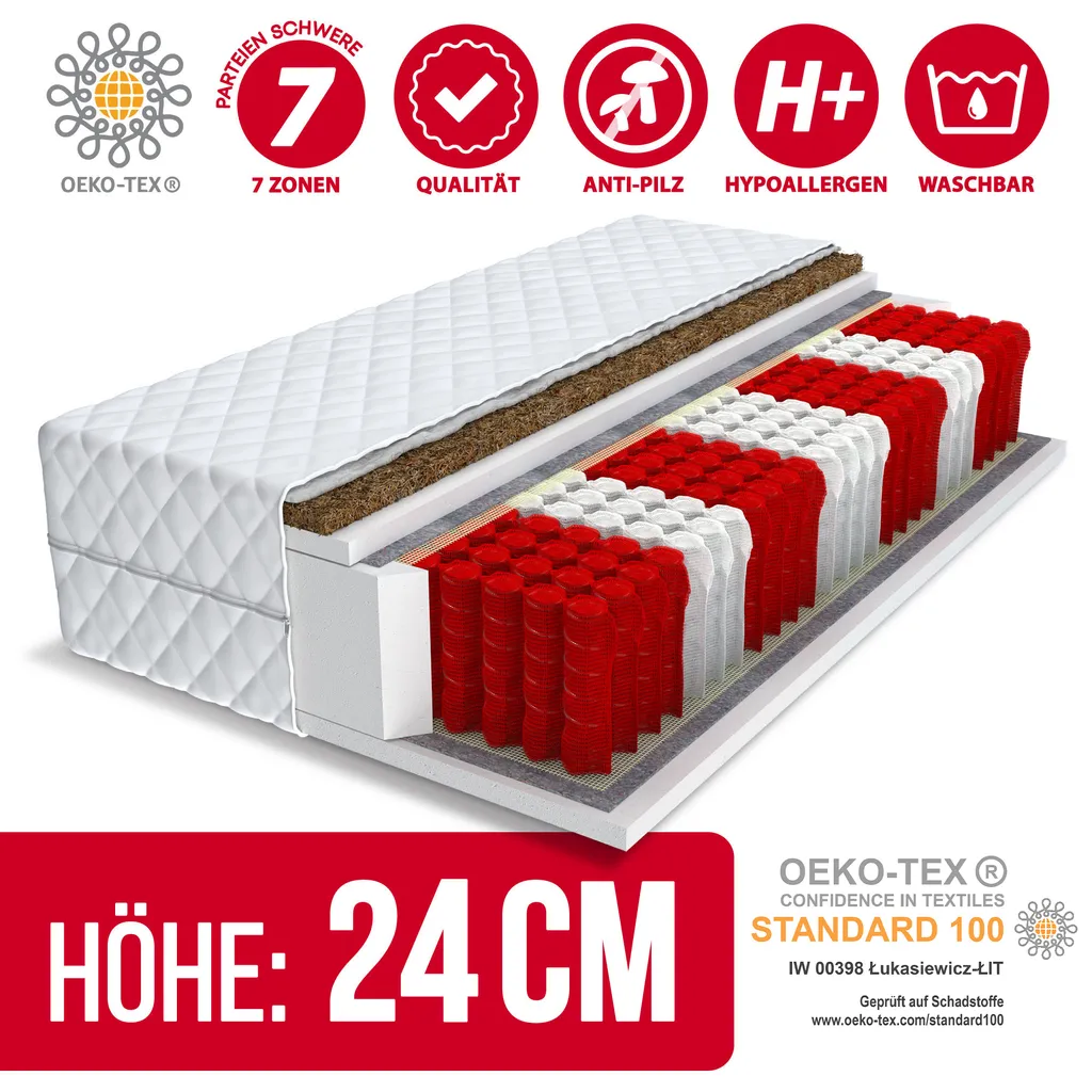 wird in der Multipocket NanoHARD-Technologie hergestellt. Die Drahtfedern werden doppellt gehärtet und somit kann die Lebensdauer des Matratzen-Kerns um 30% verlängert werden.