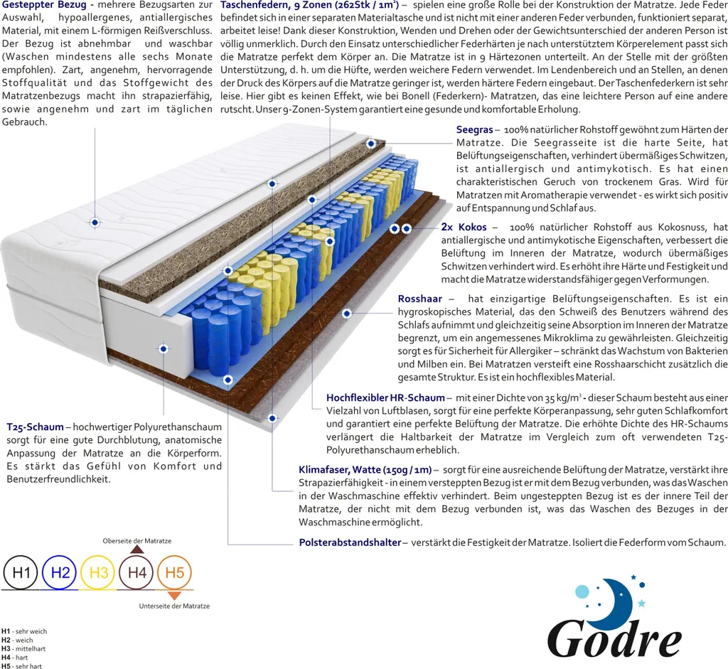 – mehrere Bezugsarten zur Auswahl, hypoallergenes, antiallergisches Material, mit einem L-förmigen ReiĂźverschluss. Der Bezug ist abnehmbar und waschbar (Waschen mindestens alle sechs Monate empfohlen). Sanft und angenehm, mit hervorragenden Stoffqualität und dem Stoffgewicht des Matratzenbezugs, was ihn strapazierfähig, sowie angenehm und sanft im täglichen Gebrauch macht.
