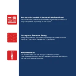 - HOCHELASTISCHER HR-SCHAUM 20 CM– Der Schaum wurde aus Millionen von Bläschen gefertigt, sorgt für eine perfekte Anpassung der Matratze an die natürliche Körperform und bleibt dabei extrem leicht. Er zeichnet sich durch eine erhöhte Flexibilität aus, die den Nutzungskomfort erheblich erhöht und seine Lebensdauer verlängert, sowohl auch durch Haltbarkeit und Beständigkeit gegen Verformungen. Ein weiterer Vorteil des HR -Schaums ist seine poröse Struktur, die eine hervorragende Luftzirkulation bietet und die Entwicklung von Pilzen und Schimmel verhindert.