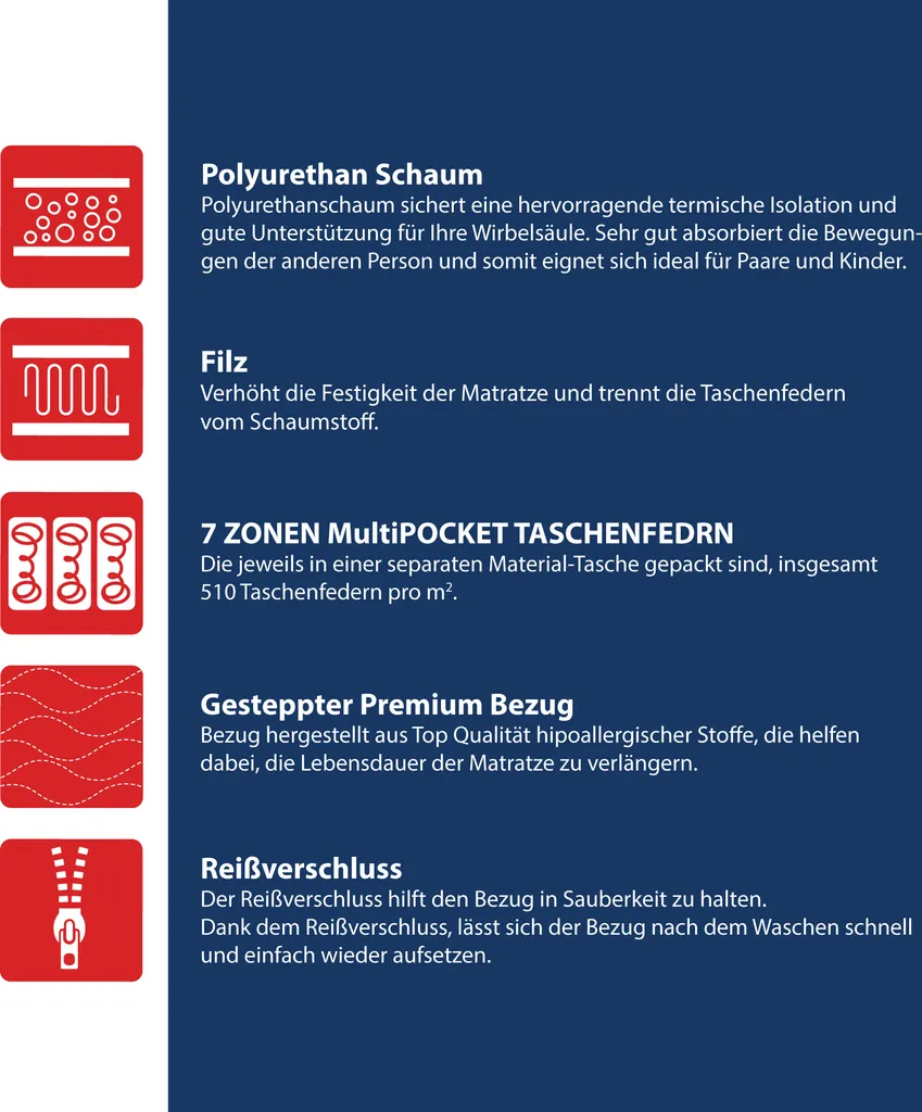 - Die MULTIPOCKET-Einlage ist die nächste Generation von Taschenmatratzen. Seine Konstruktion basiert auf Federn, die in elastischen Stofftaschen eingeschlossen sind. Es gibt viel mehr Taschen pro Quadratmeter als bei Taschenmatratzen. Dank dieser Lösung funktioniert jede Tasche sozusagen einzeln und schafft so eine Punktflexibilität. Das Taschenformat unterteilt die Oberfläche der Matratze in 7 Zonen, die jeden Körperteil separat stützen und sich an sein Gewicht anpassen. Multipocket-Matratzen zeichnen sich durch ihren hohen Schlafkomfort aus. Darüber hinaus wurde der Draht für die Federn mit der NanoHard-Technologie hergestellt und gehärtet, was die Lebensdauer des Multipocket-Einsatzes erhöht.